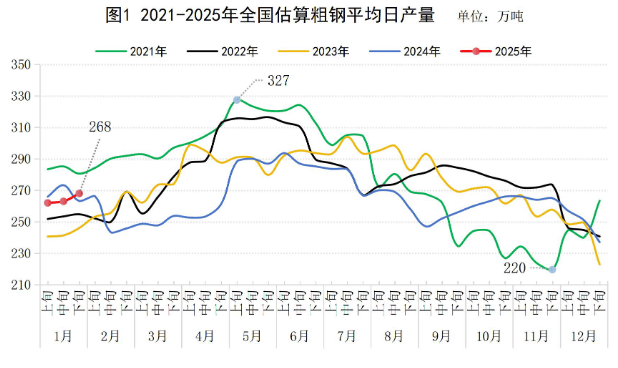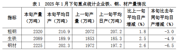 2025年1月下旬,重點統(tǒng)計鋼鐵企業(yè)共生產(chǎn)粗鋼2320萬噸,平均日產(chǎn)210.9萬噸,日產(chǎn)環(huán)比增長1.8%;生鐵2089萬噸,平均日產(chǎn)189.9萬噸,日產(chǎn)環(huán)比增長2.5%;鋼材2225萬噸,平均日產(chǎn)202.3萬噸,日產(chǎn)環(huán)比增長2.6%(見表1)。