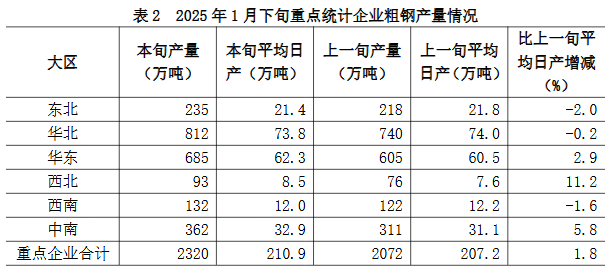 1月下旬六大地區(qū)中,除華東、西北、中南地區(qū)重點統(tǒng)計企業(yè)粗鋼日產(chǎn)量較上一旬有所增長外,其它地區(qū)均有所下降(詳見表2),具體為: