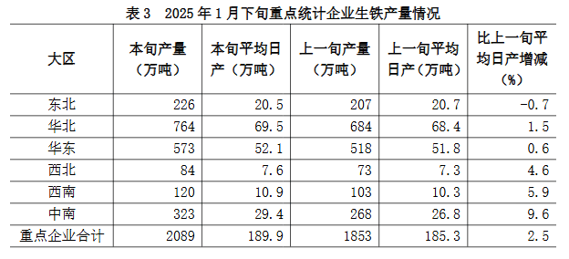 1月下旬六大地區(qū)中,除東北地區(qū)重點統(tǒng)計企業(yè)生鐵日產(chǎn)量較上一旬有所下降外,其它地區(qū)均有不同程度增長(詳見表3),具體為:
