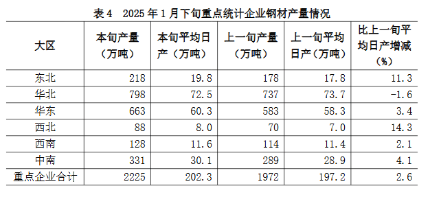 1月下旬六大地區(qū)中,除華北地區(qū)重點統(tǒng)計企業(yè)鋼材日產(chǎn)量較上一旬下降外,其它地區(qū)均有所增長(詳見表4),具體為: