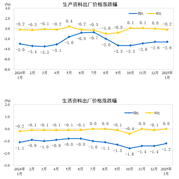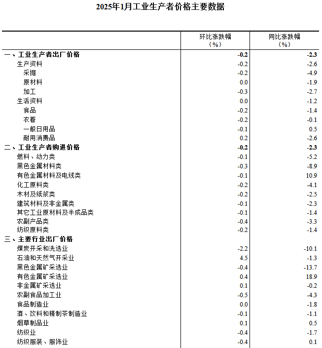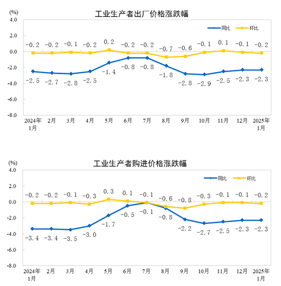 2025年1月份,全國工業(yè)生產(chǎn)者出廠價格和購進(jìn)價格同比均下降2.3%,降幅均與上月相同;環(huán)比均下降0.2%。